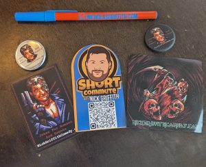 This is Nick Griffith Comedy Merch Pack with at least 6 items. Stickers, Magnets, Buttons, Pens- who knows!!!???
